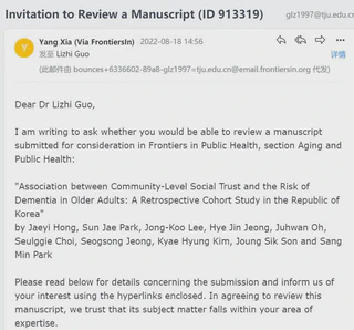 Lizhi was invited as a reviewer of Frontiers in Public Health!Sep 15, 2022 · 1 min readLizhi was invited as a reviewer of Frontiers in Public Health!Last updated on Sep 15, 2022 AuthorsLizhi GuoPhD Candidate ← Lizhi was invited as a reviewer of Frontiers in Cardiovascular Medicine! Sep 15, 2022Outstanding Master's Thesis of Tianjin University May 26, 2022 →